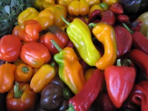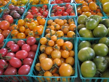 My family bought some tiny little colorful tomatoes, which were just so cute and tasted divine! Big tomato flavor! Very fresh. We devoured the little basket in one sitting; it was like eating healthy jellybeans!