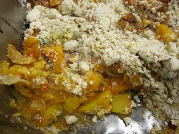 5. Discard the bay leaf from the squash mixture. Sprinkle with parsley and Parmesan; stir gently. Transfer the vegetables to the baking dish. Spoon the crumble mixture on top.