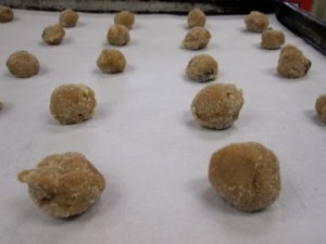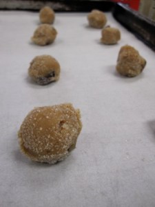 3. Place sprinkling sugar — the remaining tablespoon — on a plate. Drop by rounded teaspoonfuls into the sugar, then onto ungreased cookie sheets (I lined my sheets with parchment paper), leaving several inches between for expansion. Using a fork, lightly indent with a crisss-cross pattern.