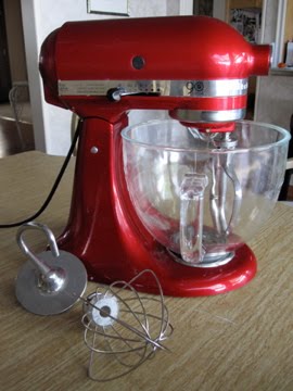 I am now the proud owner of a Candy Apple Red 90th Anniversary Kitchen Aid Standing Mixer with a glass bowl.