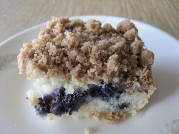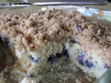 Pour the half of the cake batter into the prepared pan. Spread the blueberries over the batter, and top with the other half of the batter. Evenly sprinkle on the topping and pat it down just a bit. Bake for 35-40 minutes, or until a knife inserted though the center comes out clean. Let cool for at least an hour before slicing and serving, if you can wait that long!