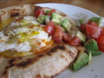 I made you the most rockin’ lunch today. It started with a warmed tortilla, topped with cheese and a fried egg. I threw together some tomato, avocado, and red onion and splashed it with lemon juice, salt/pepper, and a sprinkle of cayenne. With a dash of hot sauce! The warm, slightly browned and crunchy yet soft tortilla is out of this world! Cheesy? You betcha. Eggy? Uhhuh. Colorful? Duh.