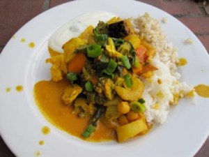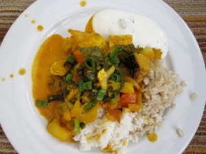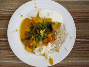 Here is a rough recipe for the curry (you can subsitute any vegetables/fruits that you like and you can also add meat if you choose). Honestly, I just threw in a pinch of this and a squeeze of that…after cooking such large batches of food for so many meals, I feel fairly confident when I do not use exact measurements. The palm of my hand is a sufficient measuring device.