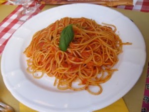 The ladies ordered two kinds of pasta: simple spaghetti al pomodoro and a penne al pesto.