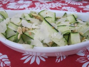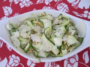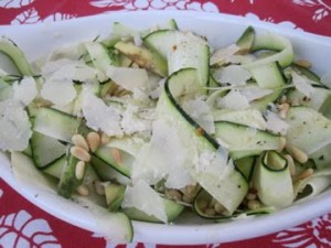 Using vegetable peeler or V-slicer and working from top to bottom of each zucchini, slice zucchini into ribbons (about 1/16 inch thick). Place ribbons in a large bowl. Add basil and nuts (and avocado if you are like me). Drizzle the dressing on and in the salad. Using the vegetable peeler, shave strips from the Parmesan wedge over the salad.