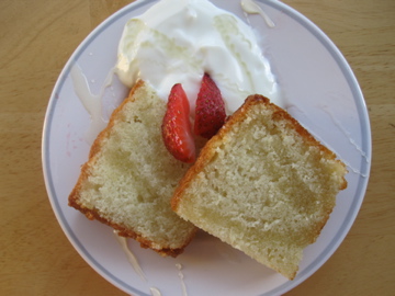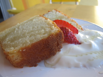 This cake knows what she likes. She likes to be cut into big, thick slices to show that she is the boss. She also appreciates the little sweet things like a drizzle of honey. Slivered strawberries make this doll pop. And some thick creamy yogurt goes right in step with her silky-smooth crumb.