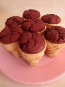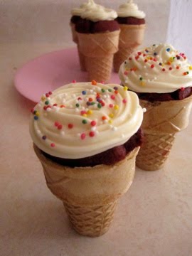 Spoon batter into flat-bottomed sugar cones set in a muffin pan and bake for 20-25 minutes or until a skewer inserted into the center cupcake comes out clean.