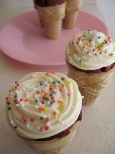 The cupcake cone idea came from the KitchyKitchen (she has a really great tutorial video). The frosting recipe was from Annie’sEats and the cake part came from the Hummingbird Bakery cookbook.