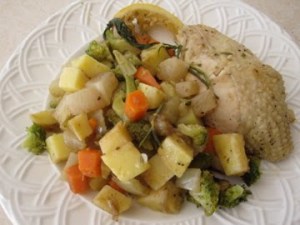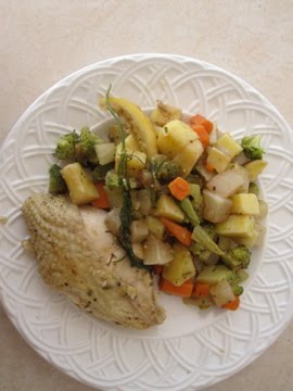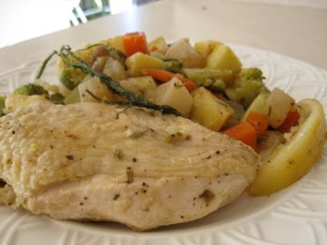 To go along with my vegetable array, I made a very simple roasted lemon chicken. Saute garlic in olive oil, add some wine, lemon zest and juice, and oregano, plop the chicken over the sauce and roast. Bam.