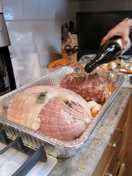 Fast forward 2 years. My mother thought it would be simpler to just by a netted breast and thigh rather than deal with the bird as a whole. We nestled the meat atop an aromatic bed of onions, carrots, and fennel. Then mama had this crazy good idea to pour an entire bottle of white wine over the whole darn thing. Crazy good.