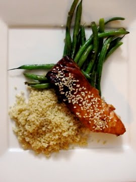 Line a baking sheet with aluminum foil (easy clean-up). Turn on the broiler to 425-450 deg F and place the rack in the middle of the oven. Place the salmon on the baking sheet (skin side up) and bake for 10-25 minutes (depending on your fish size and oven, just check it every so often). Baste every so often with the marinade. Flip the salmon over halfway through cooking. Sprinkle the sesame seeds on top during the last few minutes of baking. The salmon will be ready when flaked with a fork and done on the inside (opaque flesh).