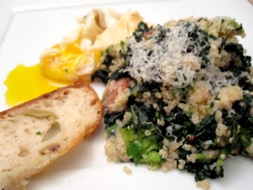 So here I give you quinoa with dark leafy greens, broccoli, grapefruit, Parmesan, yogurt, and a runny egg. And don’t forget some rustic (olive) bread to sop everything up.