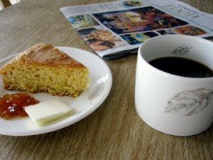 Olive oil cakes are sophisticated. They are rustic and fruity and crumbly. This Orange Cornmeal Cake is made with whole wheat pastry flour, which makes it a bit dense, but I like that. Last night I ate this cake spread with orange fig preserves while sipping the most scrumptious blood orange mandarin tea. This morning I ate more cake with a cup of coffee while reading the newspaper. What a treat it is to read the actual newspaper than to stare at my computer screen and read the news online.
