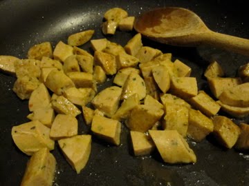 Before I started heating any pans, I made sure that I had everything that I needed for this dinner chopped and ready. Then I began sauteing my chicken sausages in a nice hot pan until browned.
