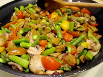 After they got nice and browned and soft, in went the garlic, followed by some chopped asparagus and halved cherry tomatoes.