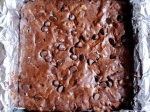 Bake for about 30 minutes or more, or until a toothpick inserted in the center comes out almost clean – if there is still a tiny bit of moist batter at the very bottom that is ok. Remove the brownies from the oven and cool completely on a cooling rack. Once cool, remove the brownies from the pan using the aluminum foil overhangs; then pull the aluminum foil away from the brownies and cut them into 16 square pieces. Serve immediately or store in an airtight container.