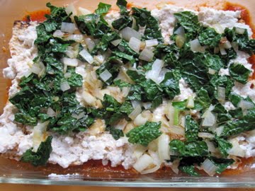 I sauteed some onion and dino-kale to add between the layers of sauce and cheese. Feel free to use mushrooms, spinach, summer squash, whatever you want.