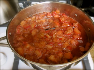So easy to make. First you chop your rhubarb, then you simmer it for 15 minutes until it softens.