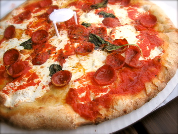 After a good solid hour of waiting in an epic line, this classic oven-baked tomato, mozzarella, and basil pizza with pepperoni was eaten in about 10 minutes, maybe less.  It was pretty dang great, though.