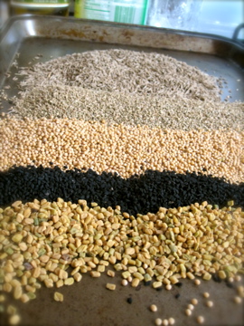 Preheat the oven to about 350 degrees F. Place all of you seeds onto a baking sheet. Toast in the hot oven for about 3-5 minutes. Immediately remove and pour the seeds into a room temperature bowl and let them cool.