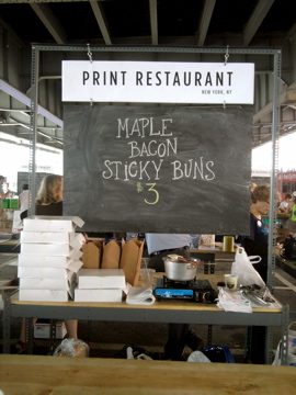 Last weekend the pastry crew from Print Restaurant set up shop to sell Pastry Chef Heather Carlucci-Rodriguez‘s famous Maple Bacon Sticky Buns. We were at the New Amsterdam Market in South Street Seaport, just below the Brooklyn Bridge.