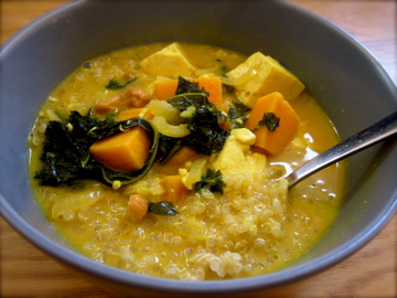 The curry is filled with dark green kale, bright orange sweet potato, and soft lean tofu. Fresh ginger and garlic and some spices give this curry a lovely flavor balance of tangy spicy and smooth. Garnished with lime and cashews for a crunchy top-note and spooned over protein-packed quinoa.