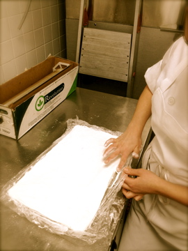 Gelatin Sheets Gettin’ Bloomed; in other words, gelatin sheets get soaked in ice water for a few minutes to soften. In the photo above they are set on a paper towel to dry off a bit.