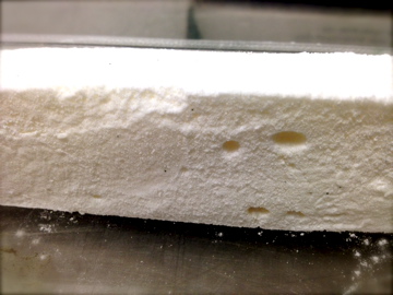 Spread It Out: The guimauve gets spread into a saran-lined tray and left to form a “skin” on top. The “skin” is just a layer of chewy sheen that develops from the evaporation of water and the coagulation of proteins (egg whites) working together after being denatured in the KitchenAid Mixer. Science. Crazy stuff.
