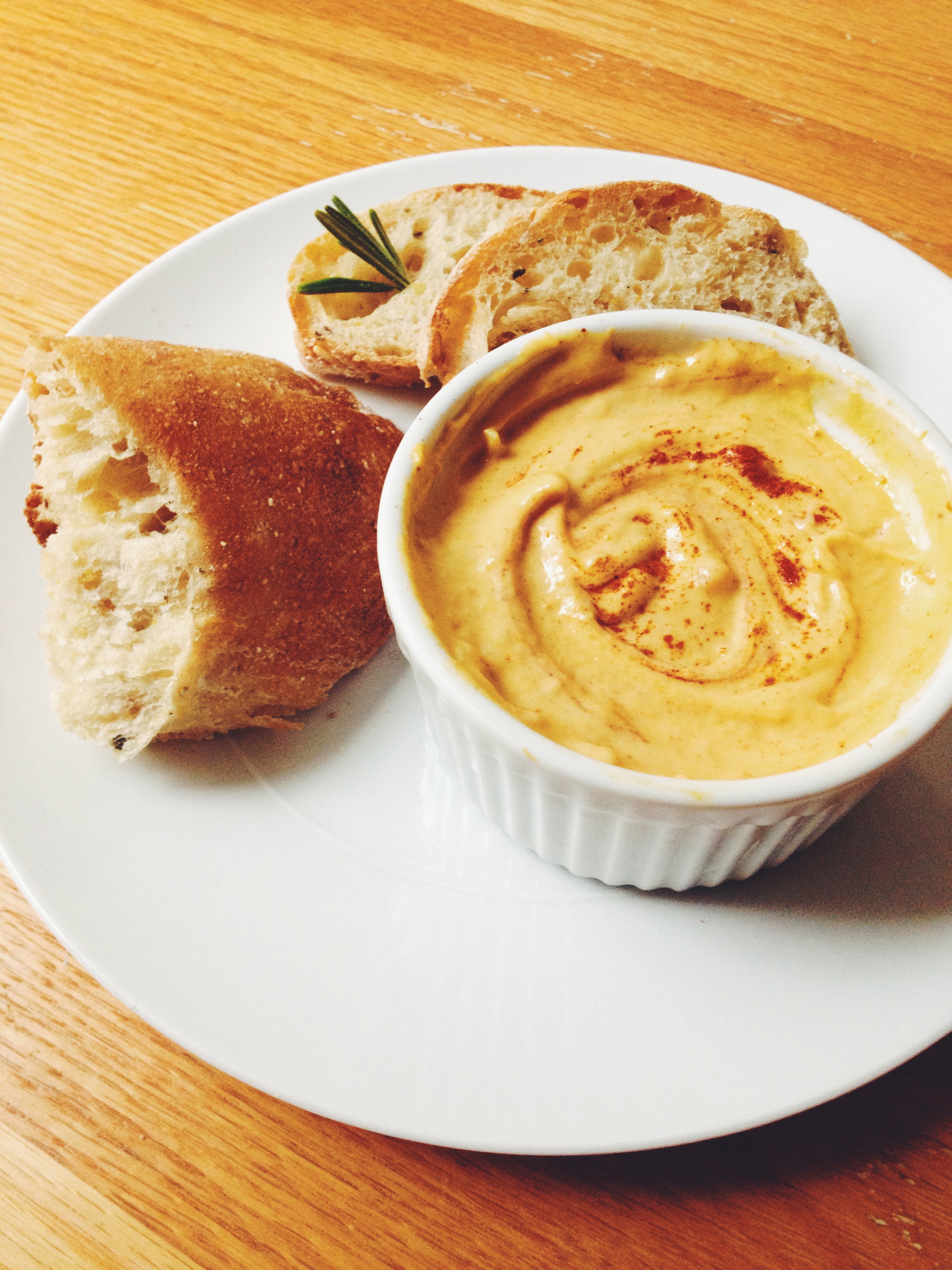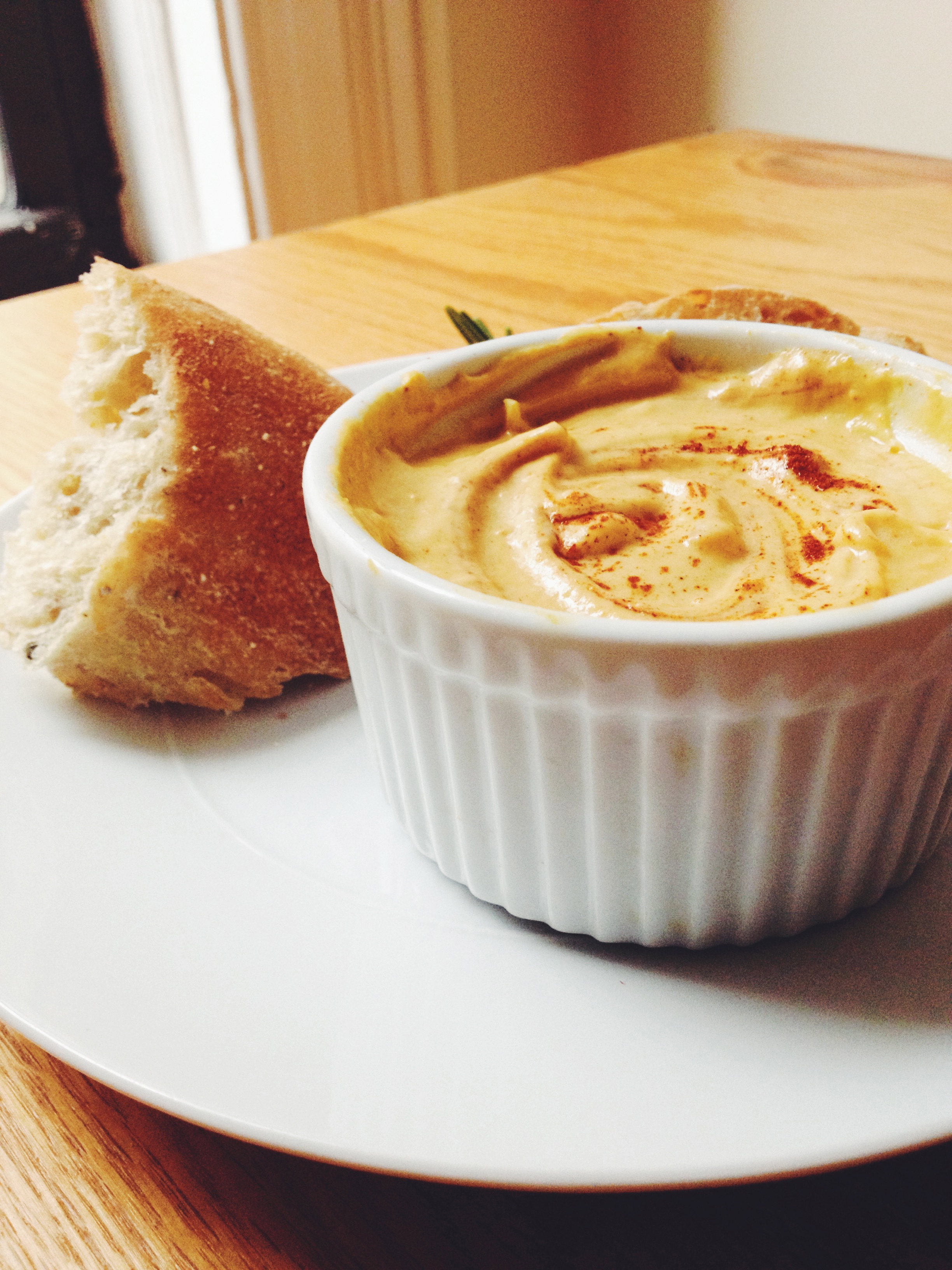 Tear up some bread (I found a great rosemary bread at my farmer’s market) or serve with crackers or veggies.