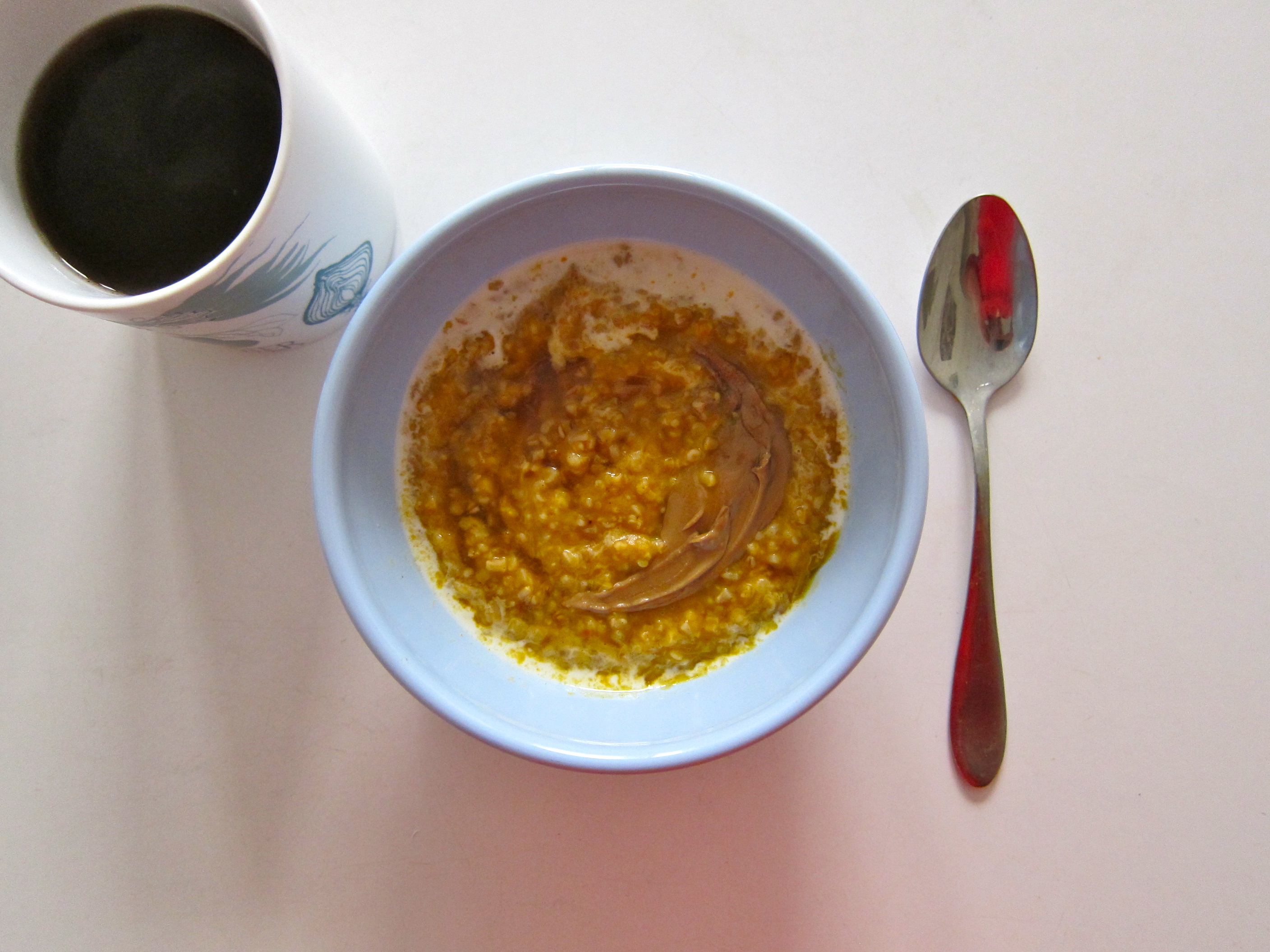 I ran out of milk, so I added a hefty scoop of pumpkin puree and accompanying spices upon simmering my oats after their overnight stay. For serving, a drizzle of maple syrup, a small splash of cream, and a swoosh of sunflower seed butter. A perfect breakfast with black coffee on yet another COLD day in New York City.