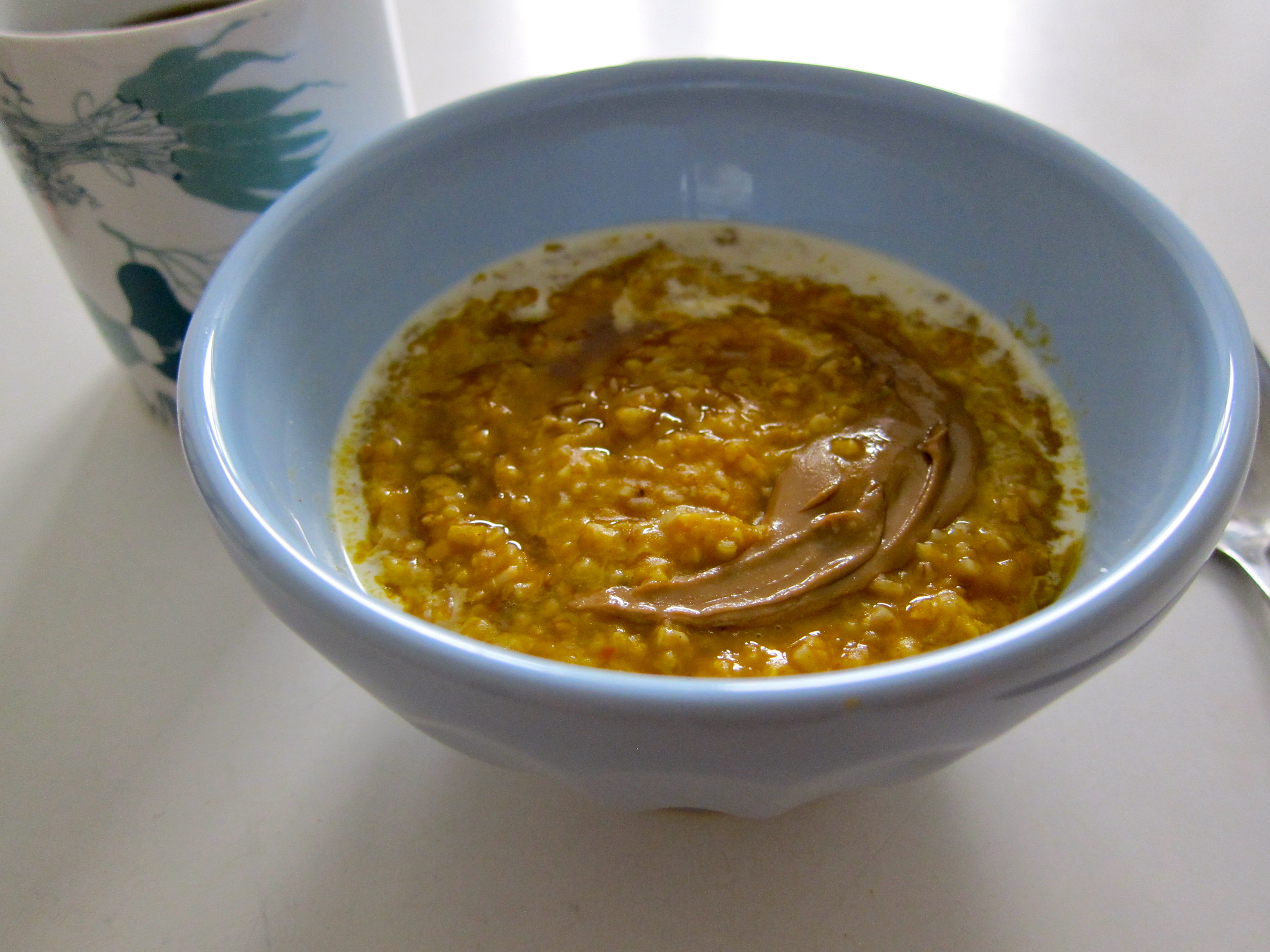 For the next morning: 1/2 cup pumpkin puree + spices (1 teaspoon cinnamon, 1 pinch each nutmeg, ginger, cloves) + 1 teaspoon vanilla + 2 tablespoons maple syrup + splash of cream + sunbutter