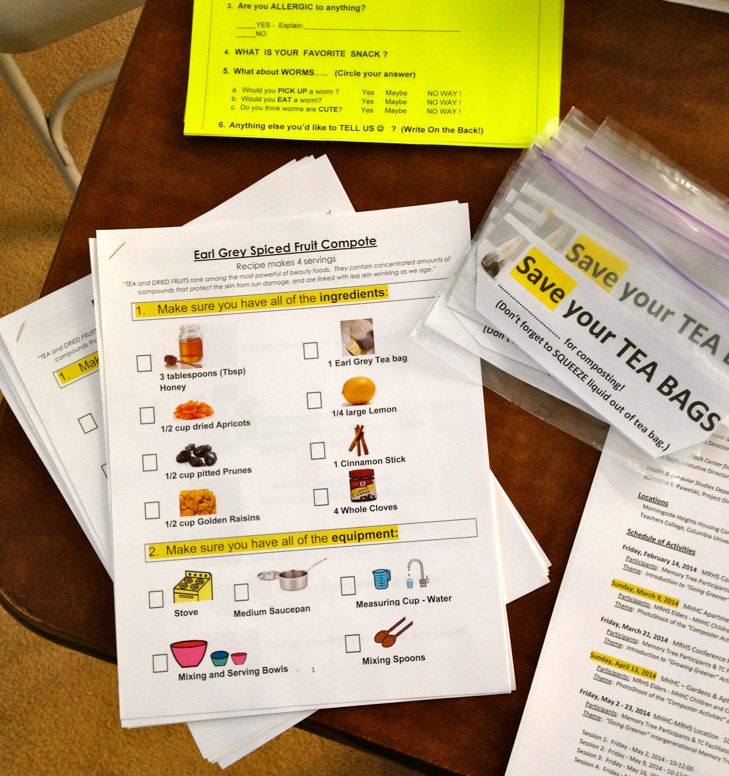 After months of planning and a handful of snow-day cancellations, this morning I helped Project Director Chris Pawelski, Ed.D conduct a “composting and healthy snacks” session for seniors with mild memory loss in conjunction with The Memory Tree Program, Teachers College, and the Morningside Gardens Co-op.