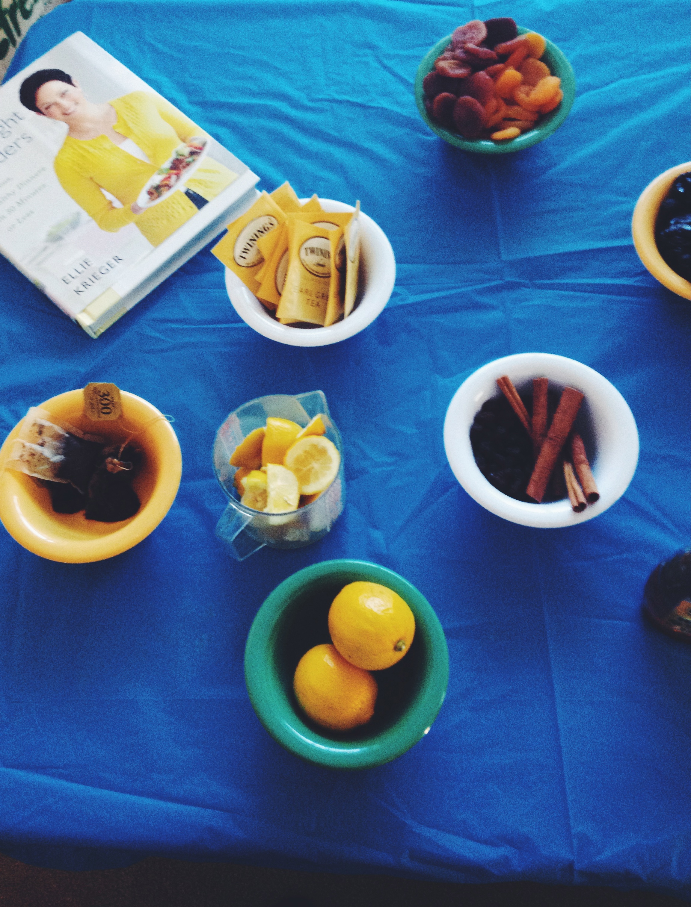 I prepared a snack for the group to complement our “save your tea bags” theme: Ellie Krieger’s Earl Grey Spiced Fruit Compote. The recipe involves heating water with tea and honey, and adding in dried fruit, cinnamon, and a squeeze of lemon. A very simple recipe that requires little effort–just measure, dump, and simmer (need a knife just to cut a lemon wedge).