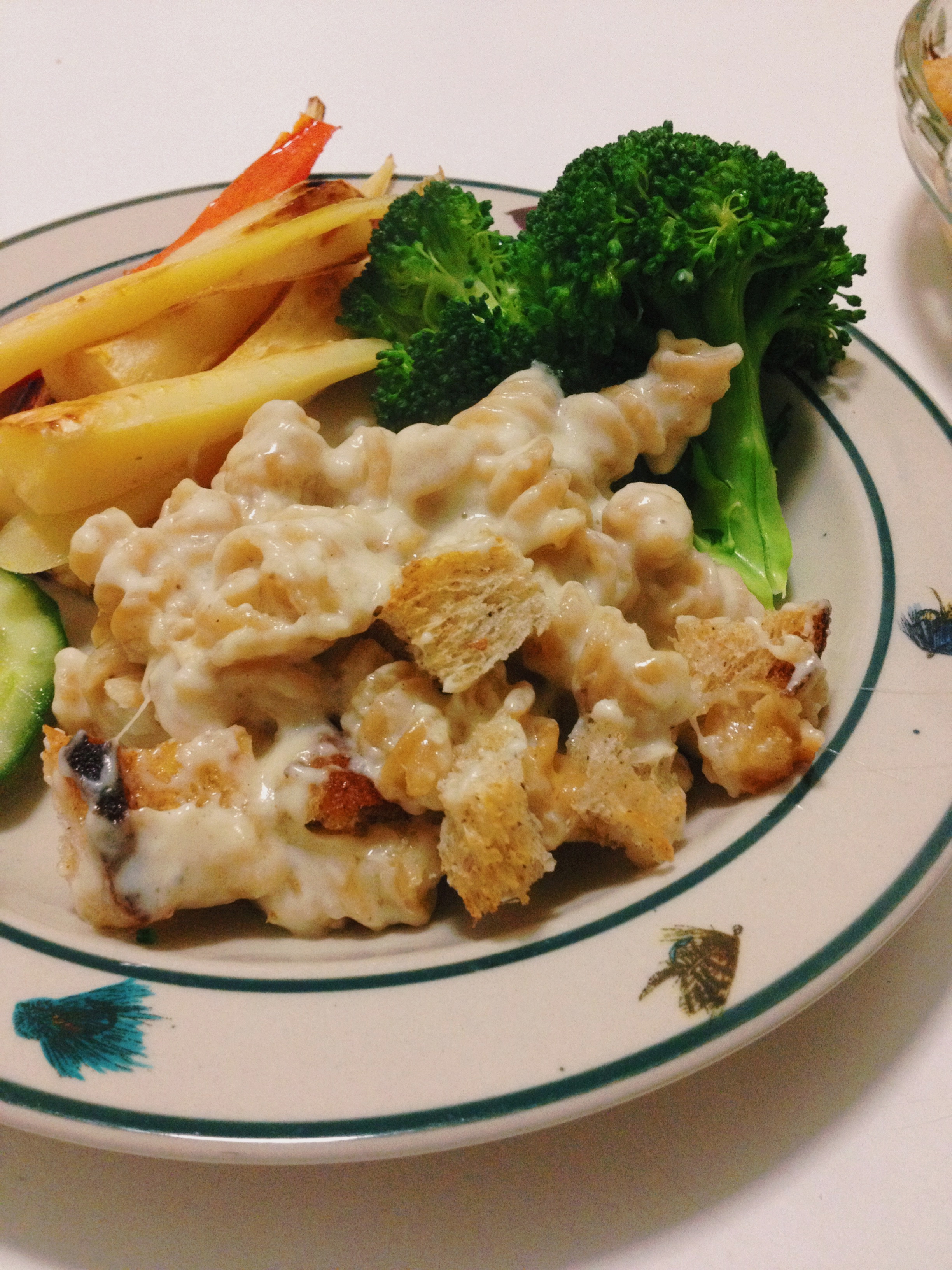 Whole Wheat “Mac” and Cheese Bake with Bread Cube Topping