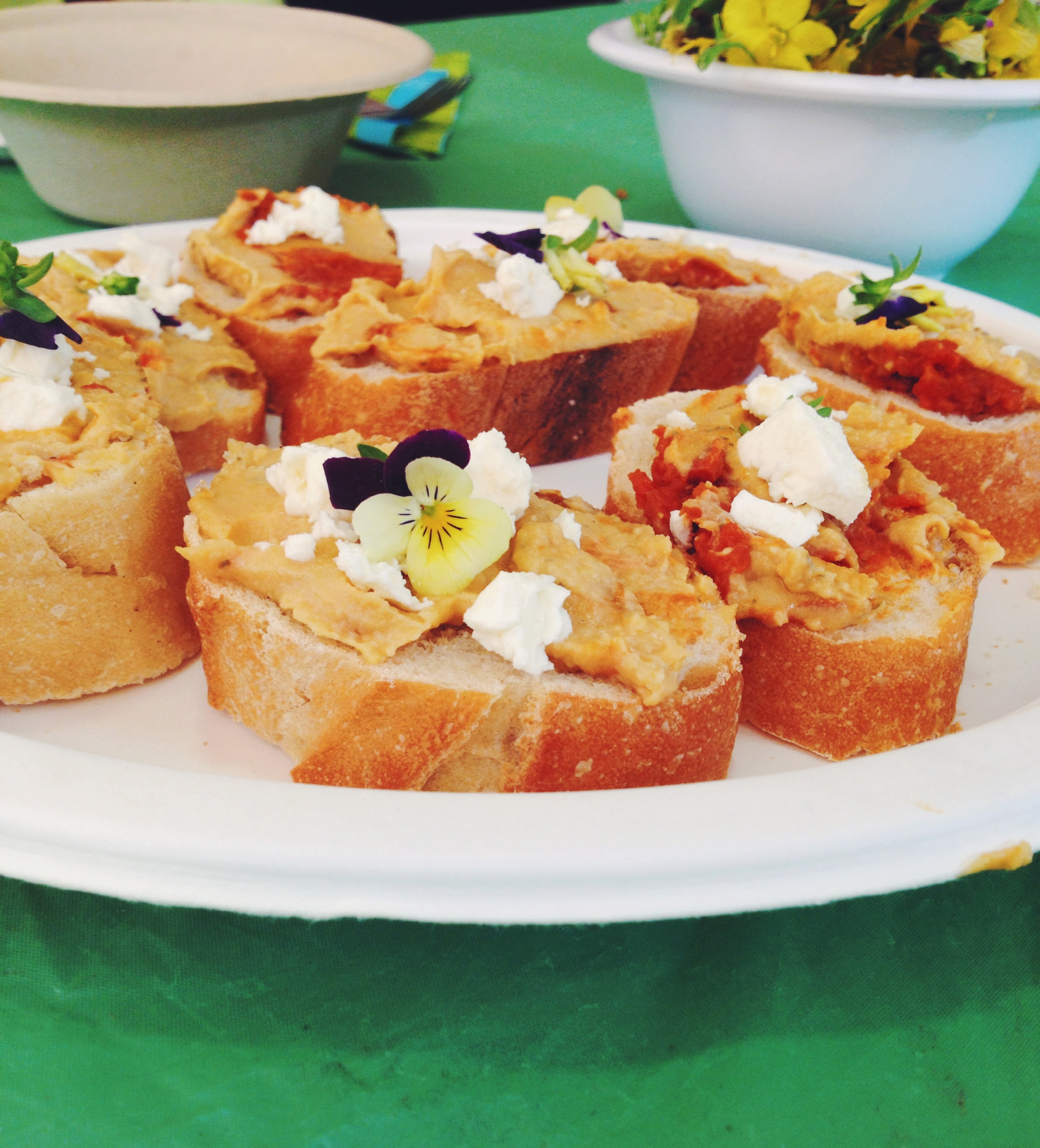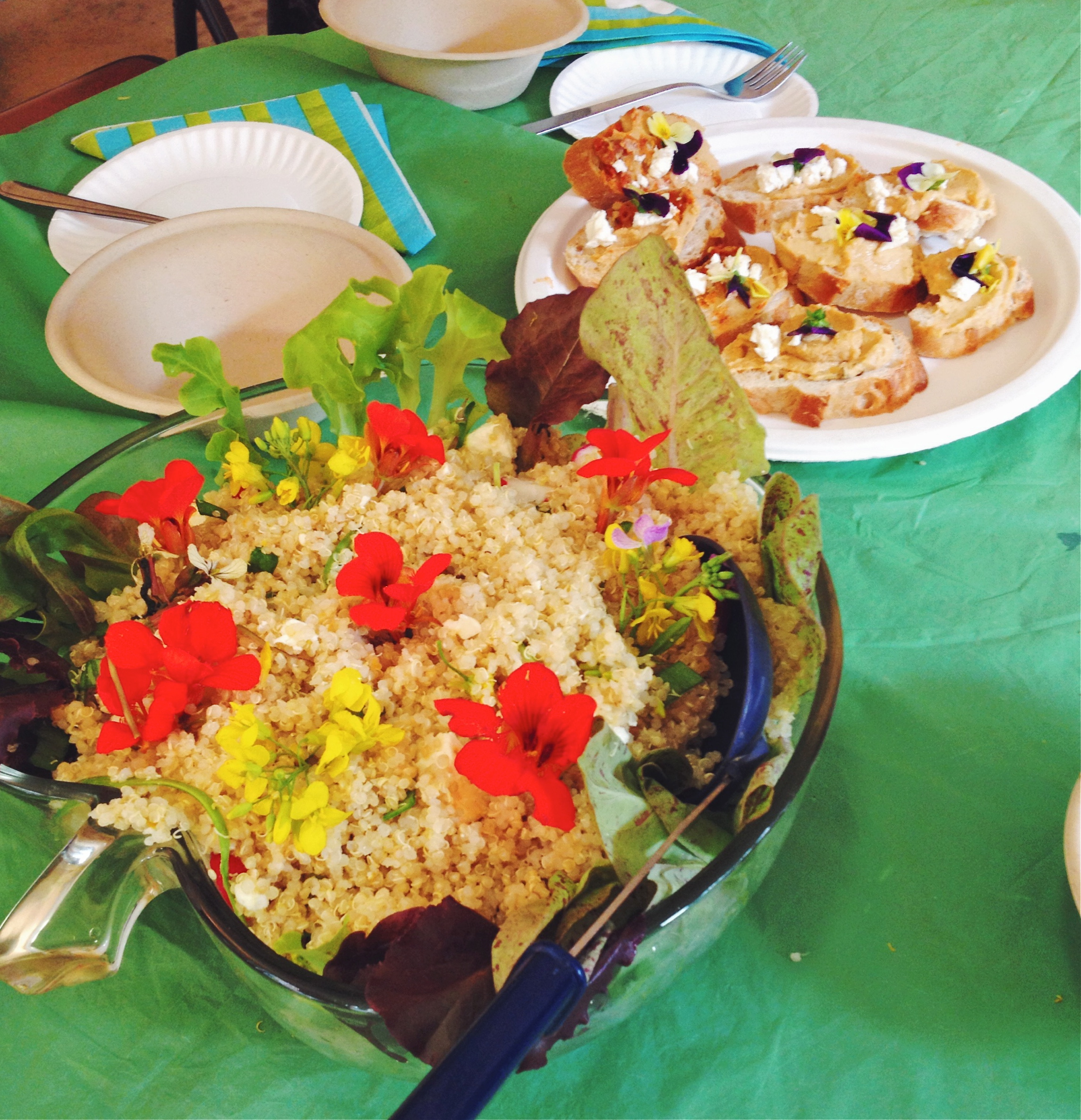 5. Spring Quinoa Salad with Edible Flowers, Hummus Feta Toasts with Pansies, Blueberry Frozen Yogurt Bites, and Sparkling Cider