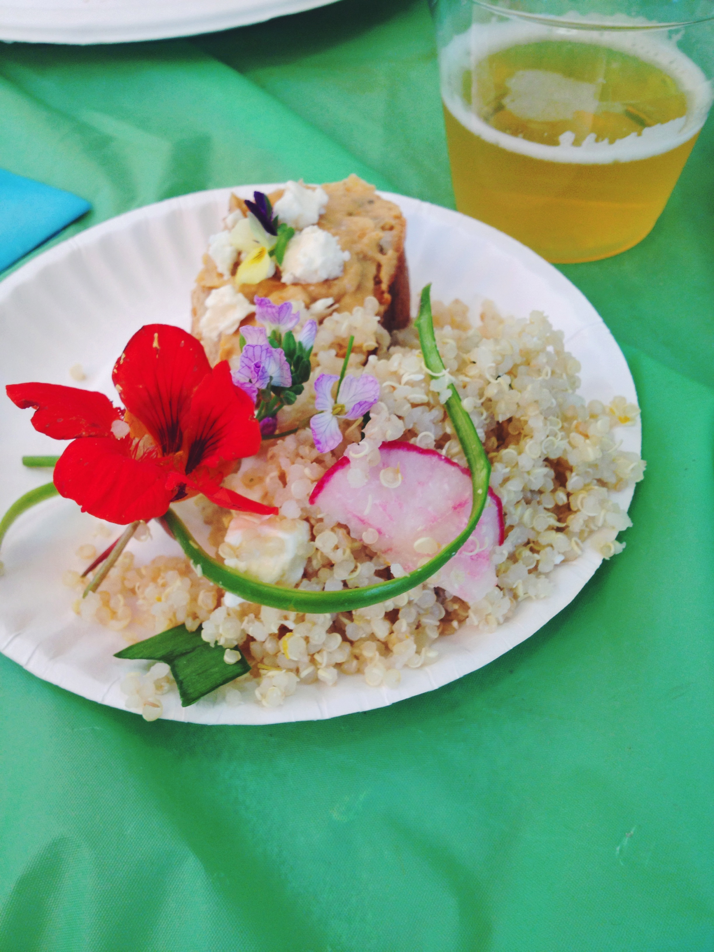 We chopped the radishes and ramps, and shaved the asparagus into ribbons with a vegetable peeler. Then we tossed everything together with the quinoa, added crumbled feta cheese, lemon zest, and lemon juice. We scooped the quinoa onto a nice bed of lettuces and delicately topped everything with nasturtium.