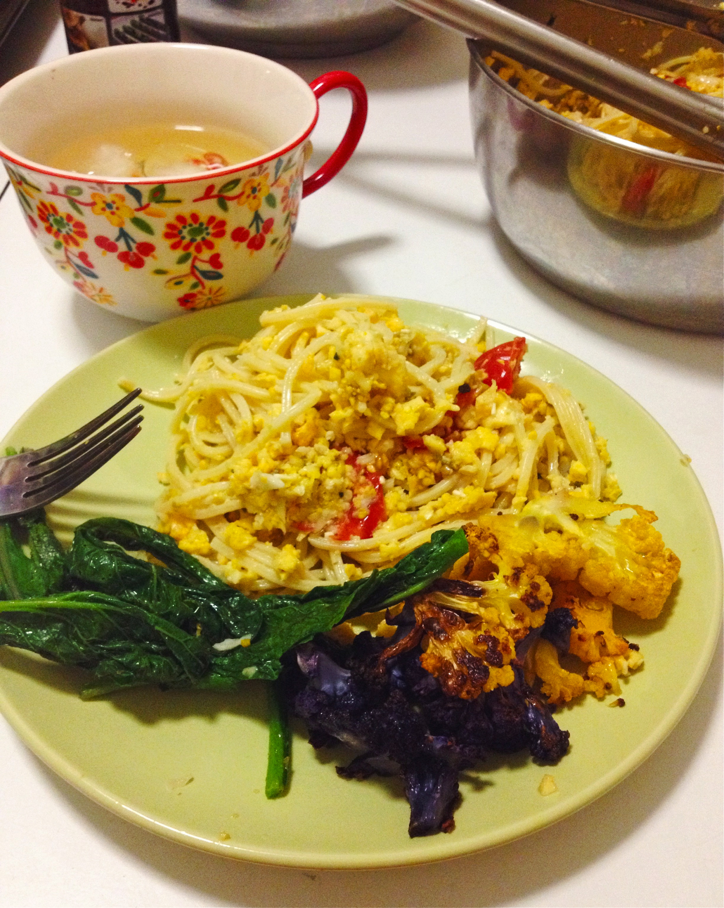 I served the pasta with sautéed radish greens and my old standby, roasted orange and purple cauliflower. To drink: Bellwether hard cider in Liberty Spy flavor that I bought on a recent road trip to the Finger Lakes. Drank it out of a mug because who needs wine glasses (?!) and drank it on ice because I did not chill it long enough. Real life.