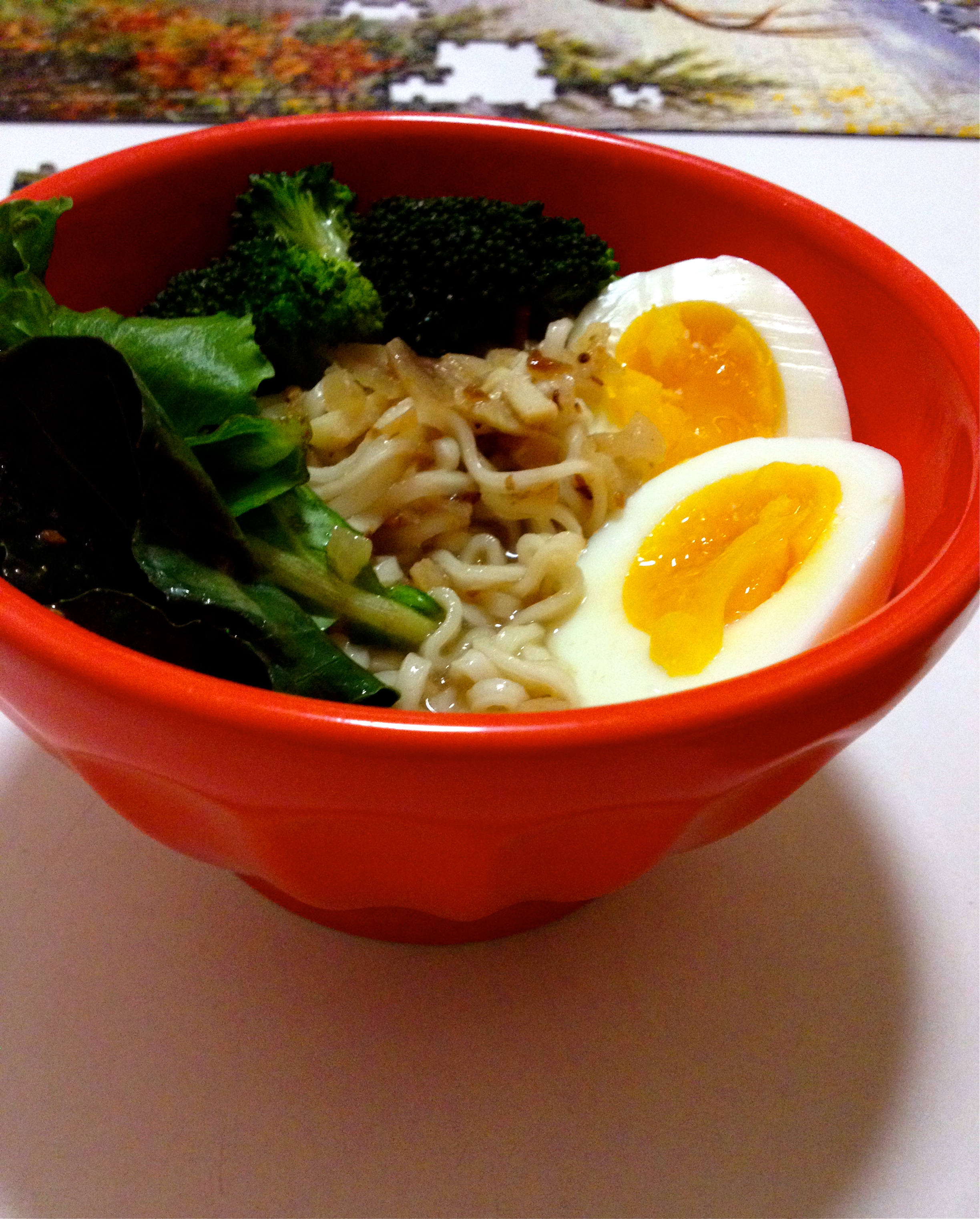 Spoon cooked ramen noodles into serving bowls. Ladle the miso broth on top of the noodles. Place your toppings–eggs, steamed broccoli, fresh greens–over the broth and noodles. Enjoy!