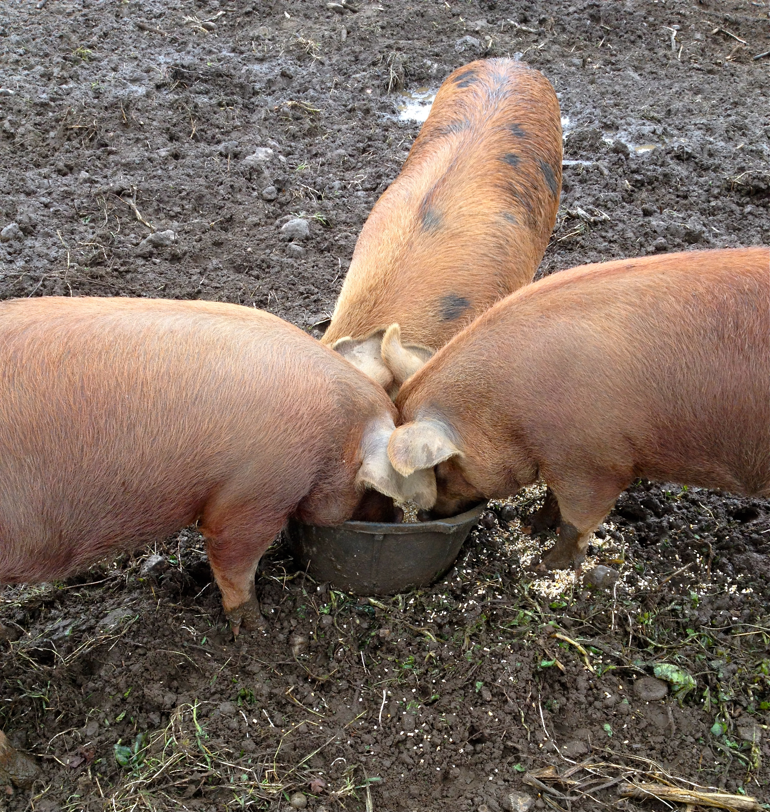 Pictured above are three of the six pigs that were on the farm, enjoying their breakfast. Pigs are always my favorite animals to see when I go visit small farms. I love their big bodies and little curly tails.