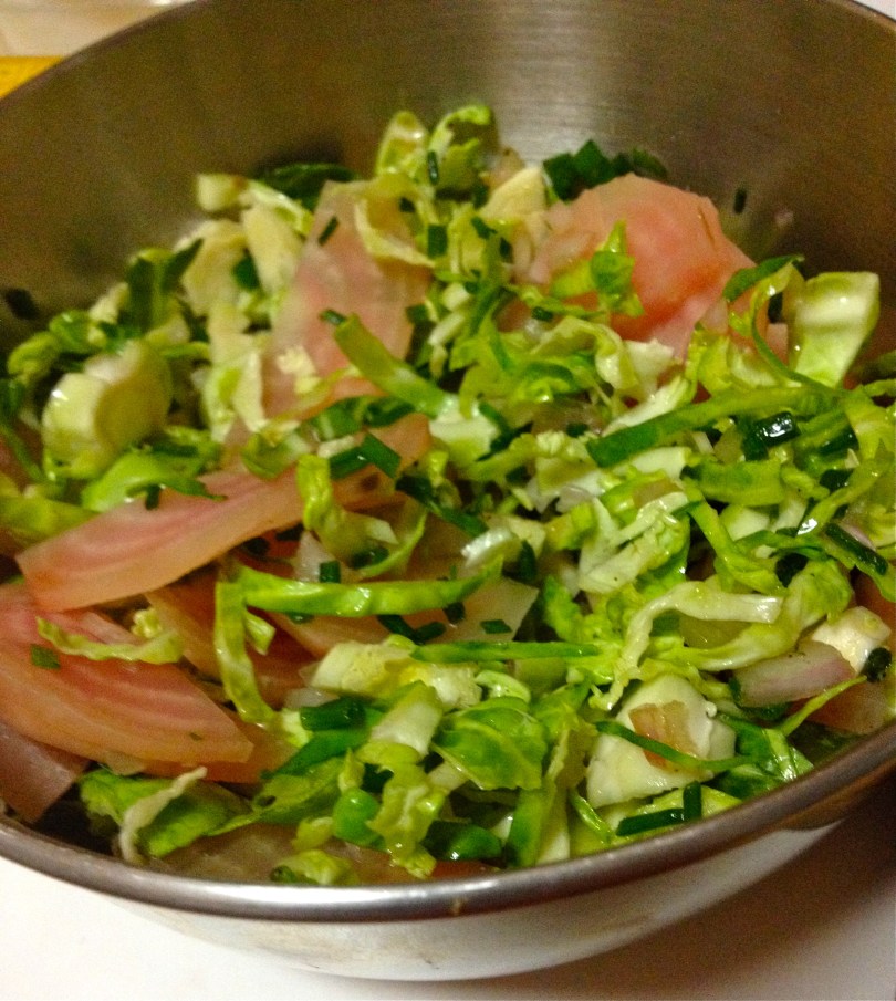 Raw Brussels sprouts with herbs, sliced beet, and dressing