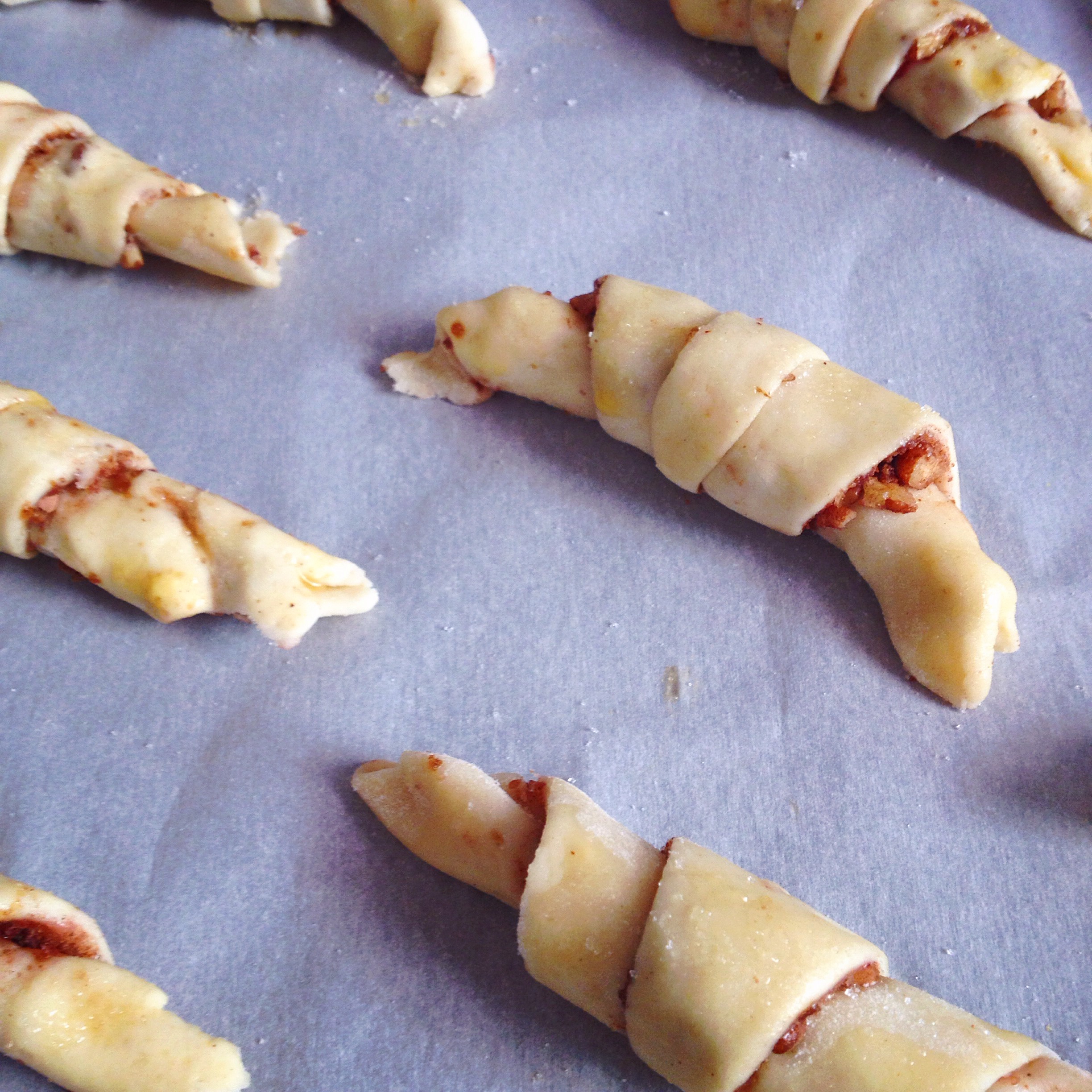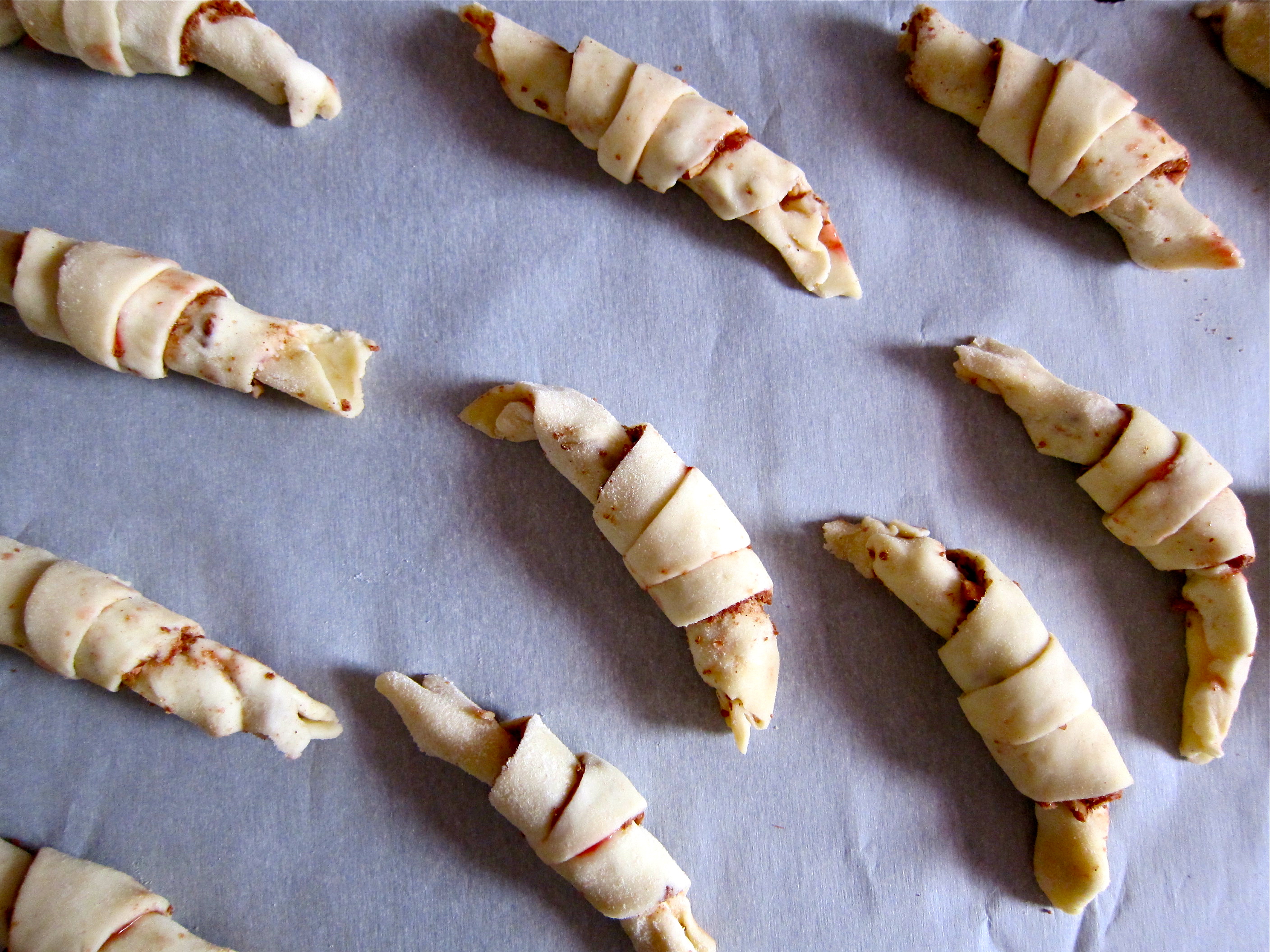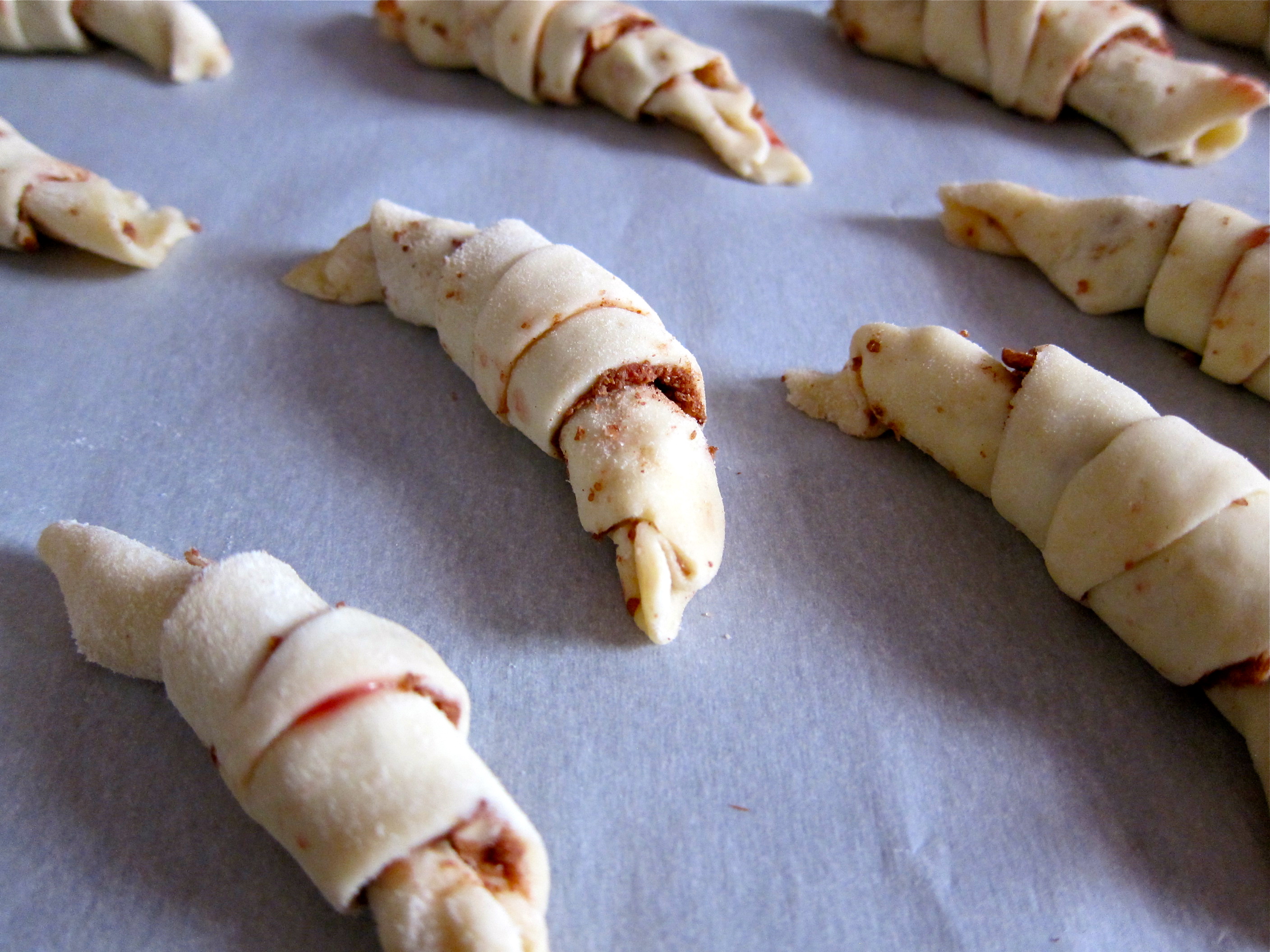 Before when I made them, I pinched the ends of the cookie dough together like I would a croissant. Now, I realize that I like the look of rugelach better when I leave them in a long shape and do not pinch the ends.