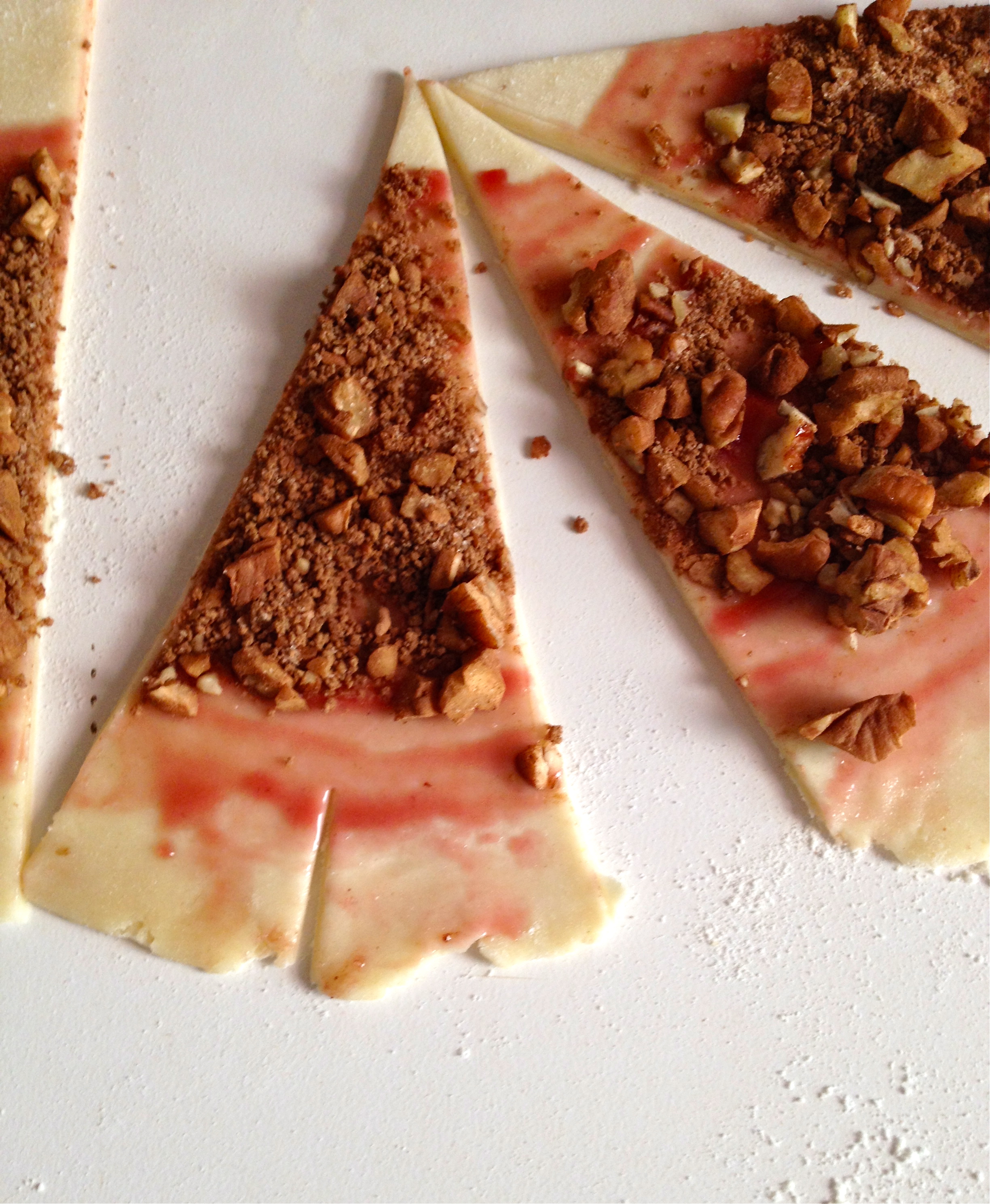 Then, cut each quarter wedge into thirds to get 12 rugelach. I cut a slit at the wide end of each rugelach triangle to make it easier to roll up.