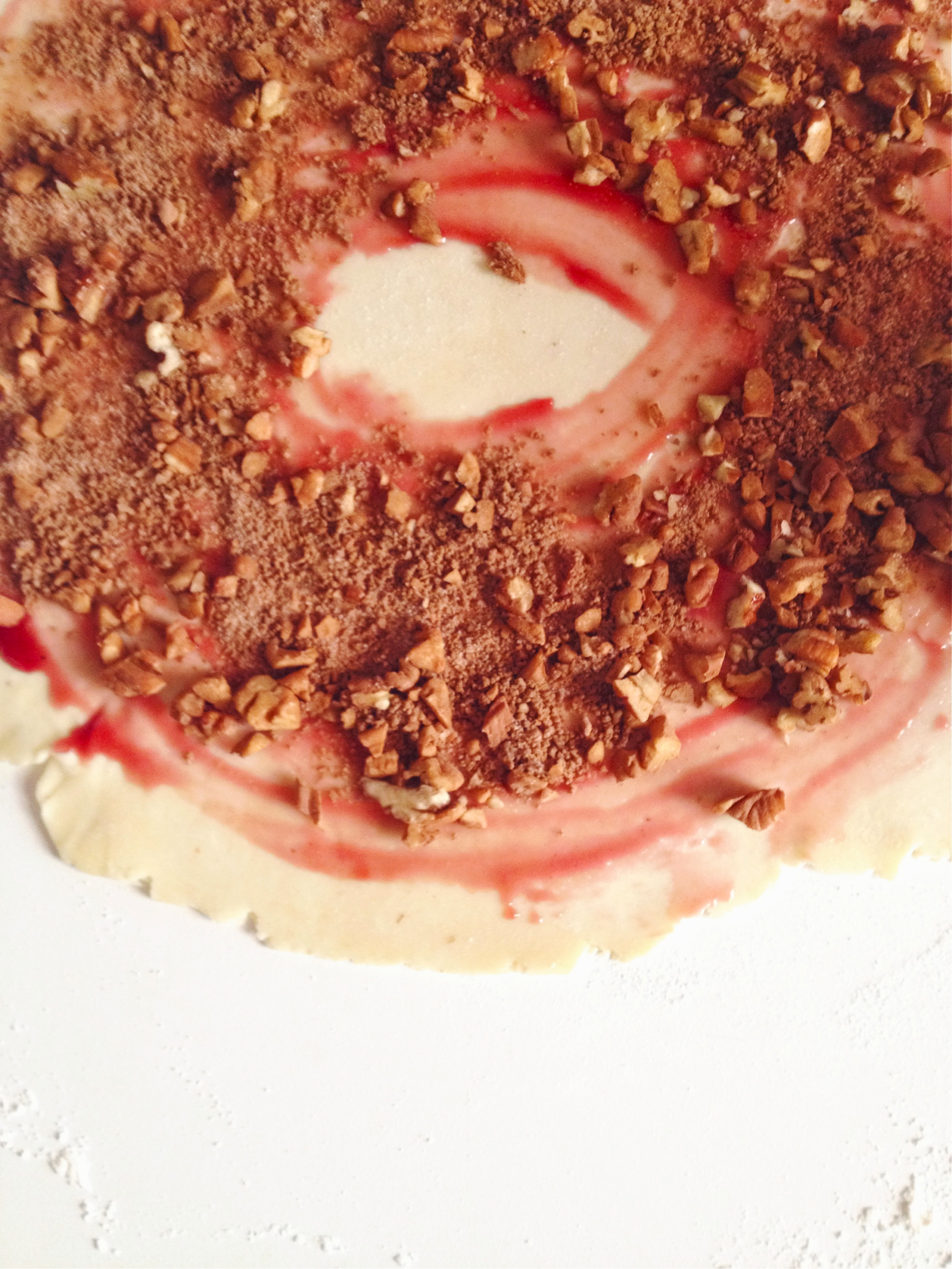 Add the jam and filling: Spread each circle of rolled dough with 2 tablespoons jam, leaving an small circle in the center without any jam. Sprinkle each jam-slicked circle of rolled dough with the filling.