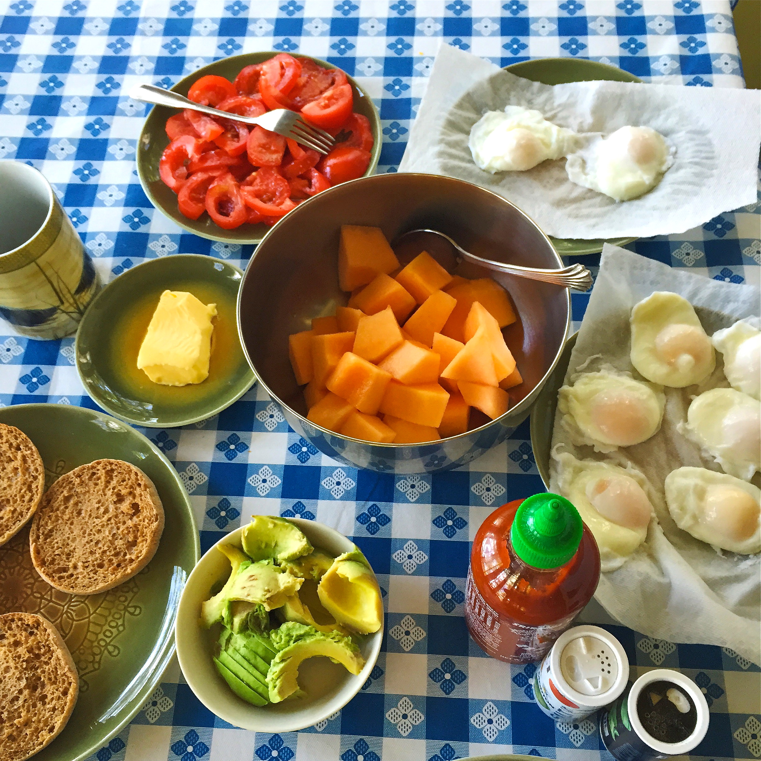 This poached egg and melon breakfast was fuel for our hike. Poaching eggs is a real blast, especially with fixings like butter, tomato, hot sauce, and avocado.