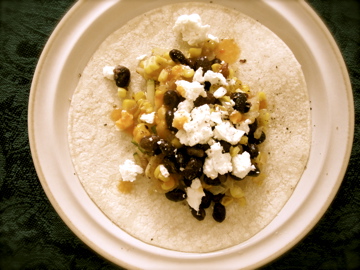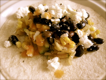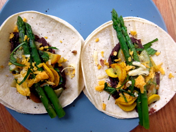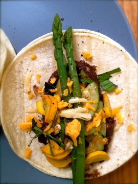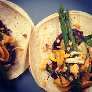 Steamed corn tortillas, refried black beans, garlicky sauteed summer squash, blanched asparagus, fresh basil, cheesy shreds, salt n’ pepper.