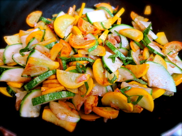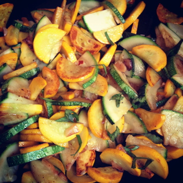 Heavy on the garlic. That was my motto for the summer squash saute. I lightly fried the garlic in just a little oil, then added my thinly sliced squash to the pan, sautéing until browned. The trick is not to move things around too much in the pan. Only stir every 1-2 minutes or so.
