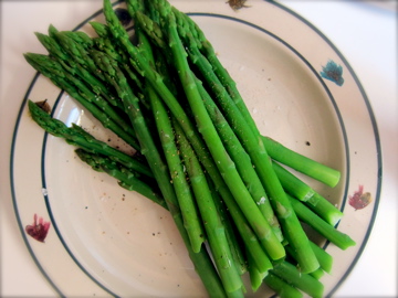 Instead, I boiled water in a large saucepan, salted the water, dropped the asparagus in for 3 minutes, took them out with tongs, and seasoned them with salt and pepper. All too easy and the result produced the most vibrant green asparagus I ever laid my eyes on.