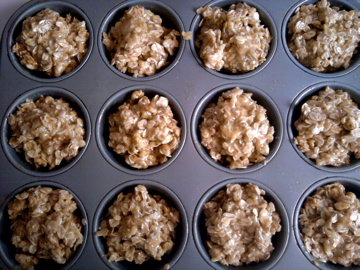 Pour the coconut oil mixture over the oat mixture. Stir a bit with a fork, add the eggs, and stir again until everything comes together into a wet dough. Spoon the dough into the muffin cups, nearly filling them.