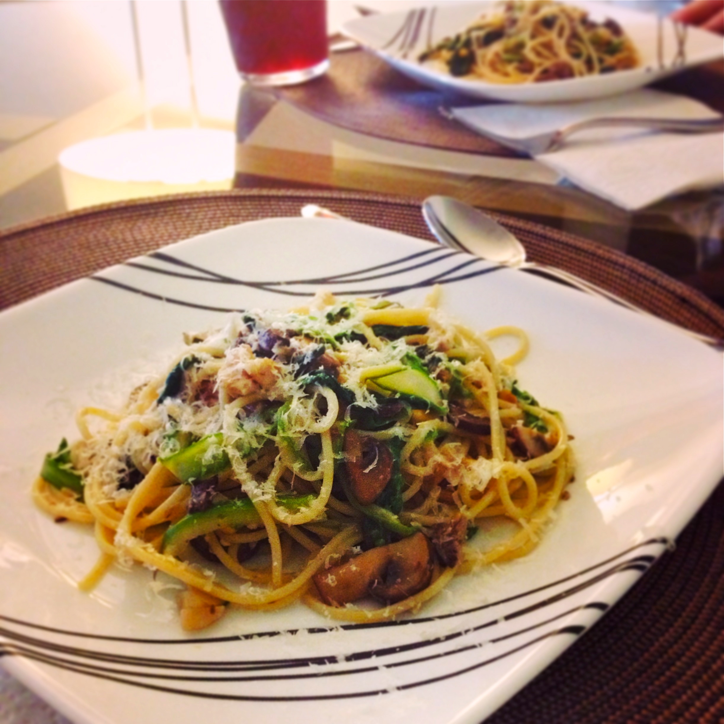 Instead of broccoli rabe, my brother and I used asparagus ribbons, fresh spring garlic, swiss chard, and cremini mushroom slices. We used toasted pine nuts, but no raisins this time.