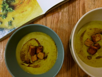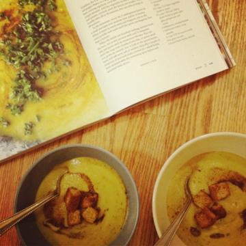 I quickly toasted some whole wheat bread croutons to accompany my soup. Snipped chives and paneer cubes as per Heidi’s recommendations sound lovely as well.